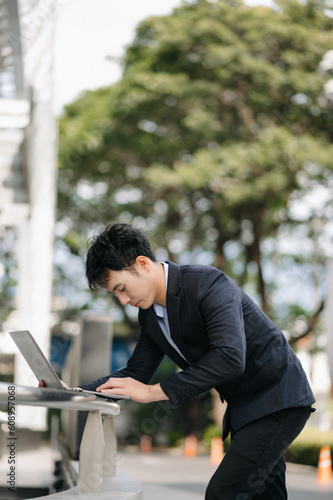 person, man, corporate, desk, document, elegant, gesture, cyberspace, laptop, mobile phone, network, online, page, paper, planning, service, smile, standing, tablet, using, men at work, businessman, device, office, phone, photogenic, web, blank, business, charming, communication, male, happy, holding, portrait, technology, outside, young, attractive, casual attire, cheerful, creative, digital, hand, asian, business center, paper, casual attire, work