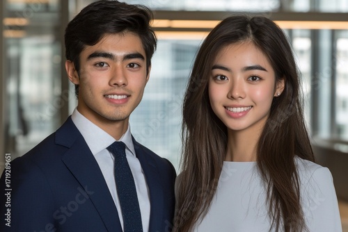 Confident Asian Professionals: Young Man in Suit and Woman Smiling in Office