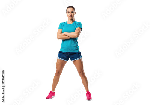 fitness, woman, athletic, strong, confident, arms crossed, activewear, physical exercise, healthy lifestyle, determination, power, studio shot, full-length, white background, muscular, active, healthy, training, gym, well-being, sport, female, adult, body, posture, motivation, health, wellness, short hair, serious, powerful, independent, modern, fit, energy, sharpened, activewear