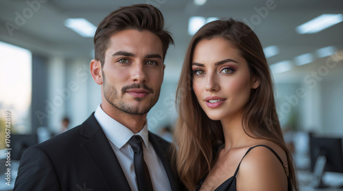 confident business couple posing together in stylish office workspace with digital working devices fashion magazine editorial cover wallpaper background
