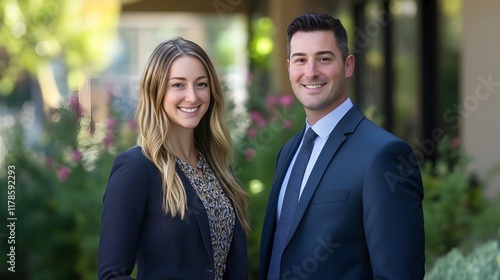 businessman, businesswoman, corporate, professional, suit, attaching, couple, smiling, portrait, exterior, building, urban, city, office, business, success, leadership, teamwork, partnership, career, executive, manager, co-worker, colleague, meeting, presentation, contract, deal, negotiation, strategy, planning, growth, opportunity, achievement