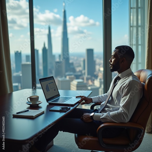 businessman, confident, man, executive, office, tower block, city landscape, urban, desk, laptop, computer, hot drink, cup, chair, leather, suit, attaching, watch, attire, professional, job, work, career, business, commerce, economic, finance, adult, one person, african american, male, ethnicity, morning, sunny, day, sunlight, desk lamp, natural light, window, blind, curtain, interior, decoration, carpet, skyscraper