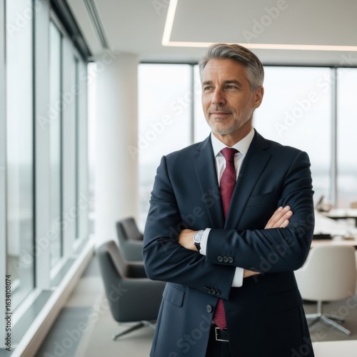 businessman, man, office, business, professional, suit, attaching, confident, arm, crossed, looking, out, window, modern, corporate, executive, leader, manager, ceo, entrepreneur, success, ambition, career, work, indoor, portrait, caucasian, grey, hair, attire