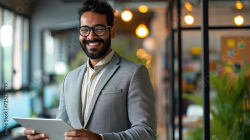 Confident businessman with tablet in modern office space. Corporate professionalism.
