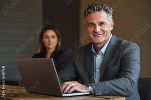 businessman, business, professional, confident, success, collaboration, teamwork, laptop, technology, office, workplace, meeting, colleague, corporate, executive, manager, leader, entrepreneur, ambition, career, growth, productivity, work, strategy, planning, modern, stylish, mature, older, man, woman, background, blurred