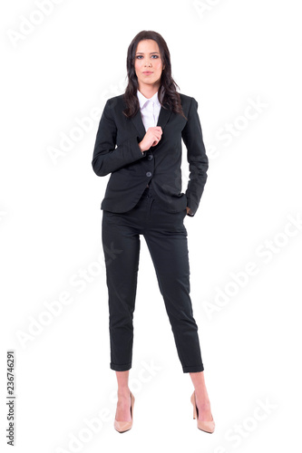 Confident businesswoman in black elegant suit holding collar posing and looking at camera. Full body isolated on white background.