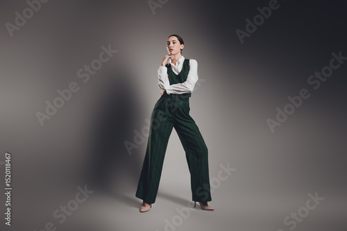 Confident Businesswoman in Elegant Green Suit Posing Against Grey Background in Studio Setting