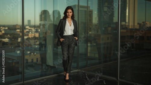businesswoman, professional, confident, suit, businesswoman, office, corporate, career, executive, leadership, success, portrait, female, city view, modern, urban, indoor, elegance, smart, poised, business attire, brunette, serious, woman