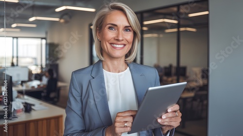 Confident Businesswoman Smiling Holds Tablet Modern Office Professional Success Happy Female Entrepreneur Gray Suit Digital Technology Workplace Technology Innovation Smart Casual Attire Businesswoman