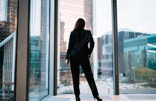 woman, business, center, work, office, confident, panoramic, window, self-assured, female, businesswoman, formal, job, respectable, director, occupation, independent, daytime, executive, intelligent, career, specialist, posh, corporate, workspace, daylight, racked, boss, personality, well-dressed, folder, entrepreneur, employee, alone, company, smart, professional, manager, expert, analyst, modern, contemporary, indoor, inside, horizontal, full body, backview