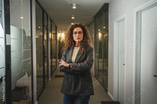 businesswoman, professional, leadership, confidence, serious, career, determination, success, manager, executive, female, woman, entrepreneur, corporate, office, corridor, hallway, modern, architecture, goggles, blazer, formal, smart, business, adult, successful, workplace, indoor, standing, one person, arms crossed, middle-aged, curly hair, ambitious, empowered, employee, entrepreneurship