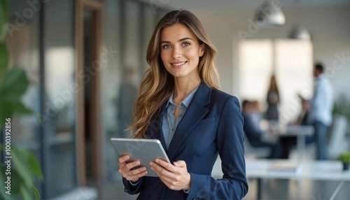 businesswoman, professional, corporate, office, tablet, technology, leadership, confident, smiling, success, career, executive, workplace, modern, business, female, device, digital, communication, entrepreneur, portrait, suit, jacket, blond, attractive, workspace, interior, background, presentation, advertisement, elegant, expertise, competent, focused, motivated, ambitious, accomplished, skilled, capable, efficient, productive, innovative, progressive, adaptable