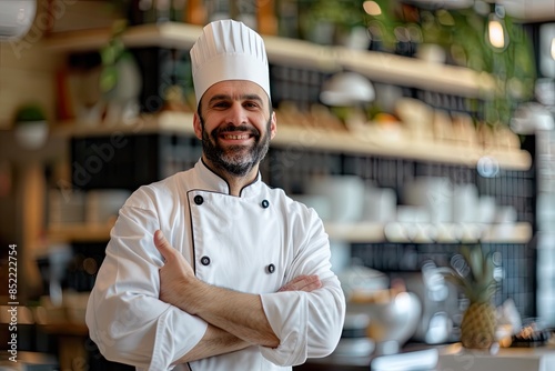 chef, cook, eatery, kitchen, uniform, hat, professional, culinary, smiling, confident, gesticulate, male, portrait, staff, hospitality, cooking, epicure, dining, interior, happy, expert, preparation, career, lifestyle, skill, standing, modern, posing, expression, profession, attire, personality, image, confidence, occupation, identity, background, stylish, contemporary