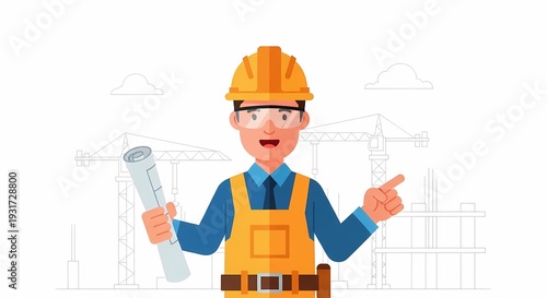 construction worker, engineer, man, hard hat, blueprint, pointing, construction site, crane, building, uniform, vest, overall, professional, architect, supervisor, contractor, plan, project, male, holding, showing, instructing, looking, happy, smiling, outdoors, workplace, urban, industry, confidence, leadership, expert, advice, future, development, planning, management, progress, safety, career, occupation, job, employment, success, vision, teamwork, illustration
