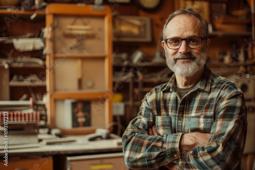 Confident craftsman standing in a vintage workshop surrounded by antique tools and clocks