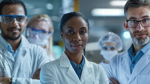 Confident diverse medical team in modern laboratory portrait image. Healthcare scientists in lab coats picture photorealistic photography. Scientific profession concept photo realistic
