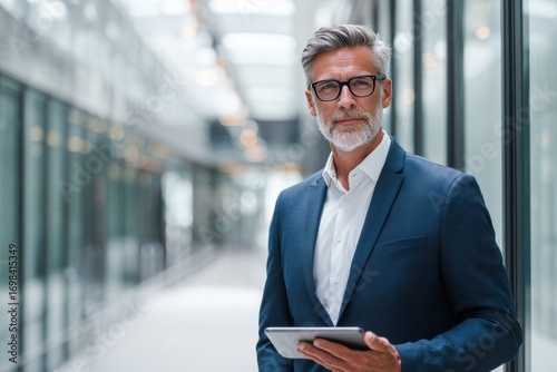 business, executive, professional, leadership, corporate, finance, technology, tablet, device, man, suit, blazer, goggles, eyeglass, middle-aged, senior, mature, modern, hallway, corridor, glasses, office, building, urban, portrait, confidence, branding, marketing, communication, team, businessman