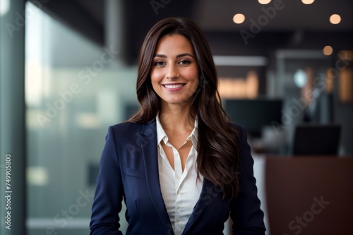 Confident female in blue blazer standing and smiling in modern office