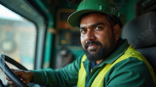 men at work, construction, hard hat, safety, vest, driving, truck, vehicle, beard, uniform, professional, site, job, operator, equipment, industrial, protective, gear, smile, confident, cab, steering wheel, workplace, occupation, skilled, labor, green, yellow, reflective, morning, focused, experienced, dedicated, accurateness, responsibility, transportation, machinery, portrait, interior, window, seat