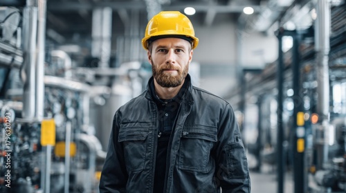 confident, men at work, hard hat, manufacturing, engineering, professional, construction, industry, factory, plant, helmet, safety, gear, technician, engineer, bearded, man, serious, portrait, focused, skilled, labor, job, occupation, uniform, protective, equipment, pipeline, pipe, background, indoor, metal, machinery, technology, expertise, quality, control, maintenance, service, inspection