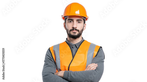 construction, men at work, male, safety, vest, hard hat, helmet, orange, professional, confident, arms crossed, isolated, engineer, builder, adult, occupation, industry, protective, uniform, job, site, labor, person, man, reflective, equipment, safety-gear, construction site, architecture, civil engineering, project, manpower, determination, responsibility, skilled, technician, foreman, supervisor, workplace, manual, industrial, engineering, transparent