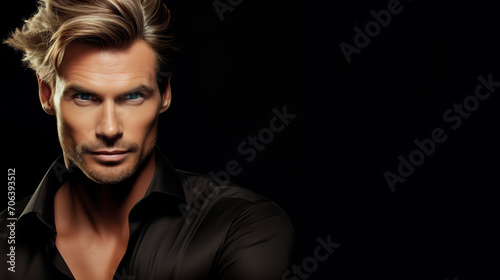 Confident male model with flowing hairstyle and black shirt
