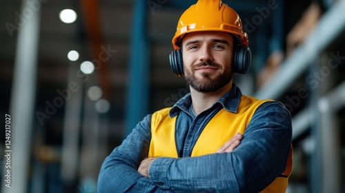 Confident Male Worker in Safety Gear with Helmet and Ear Protection in Industrial Workspace