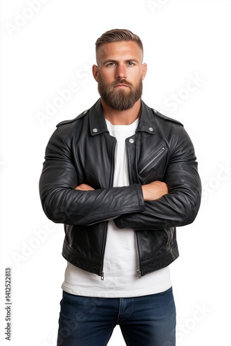 man, male, leather, jacket, fashion, confident, strong, beard, model, pose, casual attire, stylish, urban, outfit, black, modern, portrait, white, studio, jean, person, arm, crossed, serious, attitude, photogenic, expression, adult, fit, cool, classic pose, casual clothes