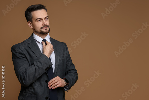 adult, apparel, attire, background, brown, business, businessman, caucasian, classic, clothes, clothing, confident, copy, custom, design, elegant, event, expensive, fashion, fashionable, formal, garment, gentleman, grey, photogenic, jacket, luxury, male, man, model, modern, necktie, outfit, person, portrait, posing, shirt, space, style, stylish, success, successful, suit, text, attaching, trendy, wear, wearing
