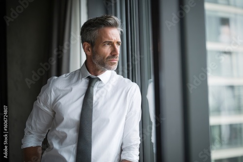 Confident man in suit gazing out high-rise window, symbolizing ambition, planning, leadership, and future business opportunities.
