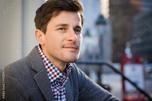 man, looking away, sitting, doorway, confident, lifestyle, contemplation, casual clothes, photogenic, smiling, entrance, happiness, confidence, daydreaming, avocation, half face, head shot, day, outdoors, one person, young adult, young men, male