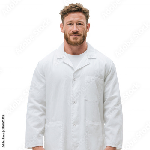 Confident man wearing a white lab coat, standing against a white isolated background. He displays professionalism and readiness for a scientific or medical environment.
