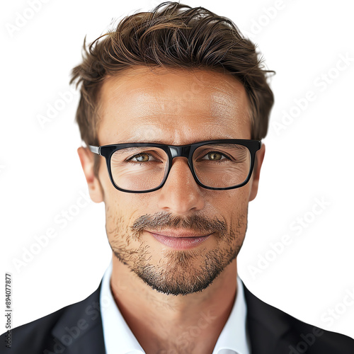Confident man wearing glasses and a suit, exuding professionalism and business acumen, isolated on white background.