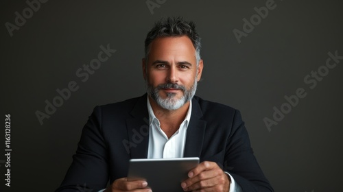 businessman, mature, man, tablet, technology, professional, portrait, confident, successful, executive, leader, business, corporate, serious, grey hair, beard, suit, jacket, shirt, dark background, studio shot, digital, modern, entrepreneur, management, leadership, career, success, ambition, stylish, elegance, sophisticated
