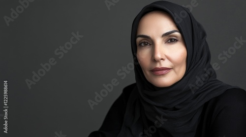 Confident mature caucasian female in black hijab against dark background