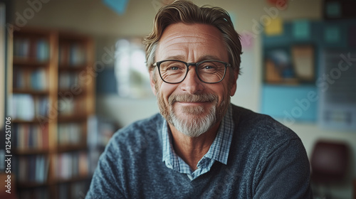 Confident Middle-Aged Caucasian Male Teacher Smiling in a Modern Classroom with Bookshelves in the Background, Creating a Positive and Engaging Educational Atmosphere for Students