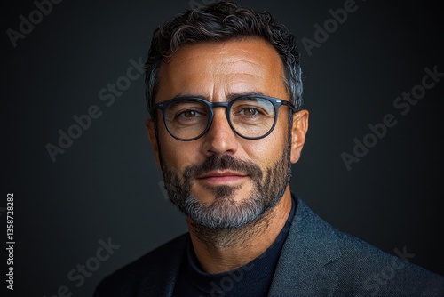 Confident Portrait: A sophisticated businessman with neatly trimmed beard, stylish glasses, and a poised expression, radiates success against a subtle, sophisticated background.
