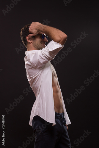 confident posing young man abs fit slim unbuttoned shirt side vi
