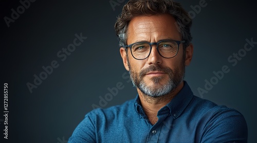 confident, businessman, professional, modern, leadership, expertise, isolated, grey background, sleek, portrait, executive, success, power, authority, goggles, face, person, people, expression, old, senior, serious, photogenic, business, fashion, black, eye, hair, guy, beard, smile, looking, model, casual attire, mature, 1, studio, closeup