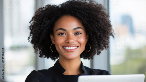 Confident professional woman with curly hair smiling in an office setting. Bright and optimistic work environment.