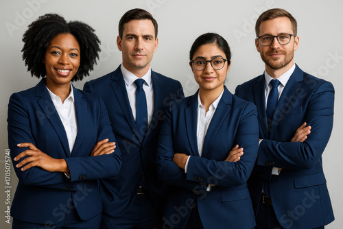 Confident Professionals: A group of business professionals stands united, exuding confidence in their tailored suits, radiating professionalism and teamwork.