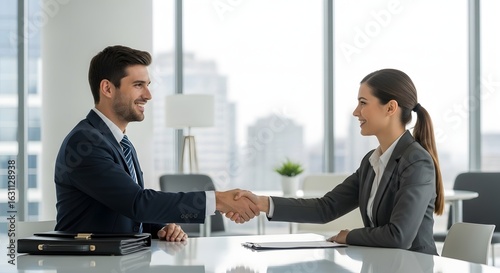 Confident professionals sealing a deal with a handshake in a bright modern office setting