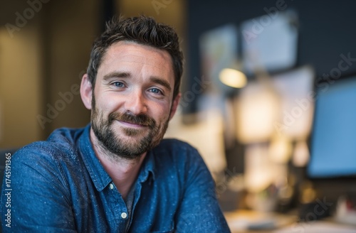 man, smile, beard, casual attire, shirt, workspace, technology, computer, desk, indoor, business, professional, portrait, happy, success, communication, laptop, co-worker, team, collaboration, workplace, digital, modern, interior, lighting, career, motivation, achievement, confidence, relaxed, friendly, focused, creative, innovation, leadership, strategy, planning, productivity, connection, network, future, development, growth, vision