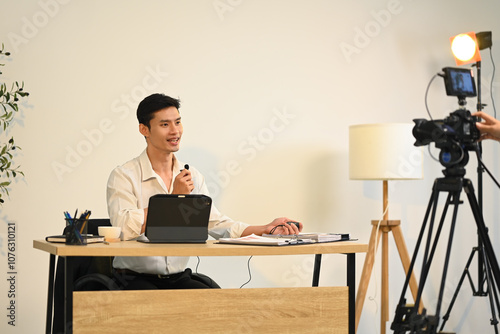 interview, streaming, filming, technology, video, camera, online, person, tutorial, web log, social, media, broadcast, screen, communication, business, talking, live, professional, teaching, camcorder, audience, modern, pledging, businessman, office, occupation, expertise, speaker, motivation, entrepreneur, employee, confidence, gesticulate, explaining, multimedia, photographing, recording, detective, advice, microphone, asking, question, answering, workplace, production, presentation