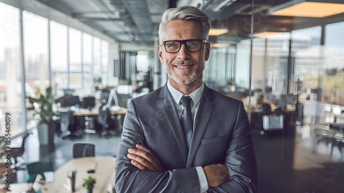 Confident Successful Businessman Portrait Modern Office Professional Executive Leader Management Gray Hair Glasses Attire Corporate Achievement Strong Determined Ambitious Goal Achiever Strategic
