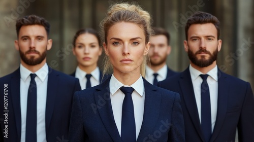 Confident Team in Suits: A team of professionals in smart blue suits and crisp white shirts, standing in formation, project an aura of authority and ambition. The female leader in the center.