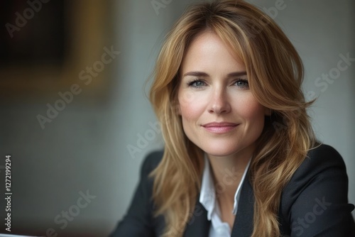 confident, woman, business attire, blazer, professional, office, smiling, desk, portrait, elegance, long hair, soft focus, relaxed, atmosphere, career, success, sophistication, corporate, setting, stylish, beauty, expression, leadership, serene, ambience, contemporary, paved, focused, friendly, charme, personality, warmth, communication, interaction, poised, attractive, fashion, detailed, workplace, determination, aesthetic, vision, clarity, professionalism, inspiration, lifestyle