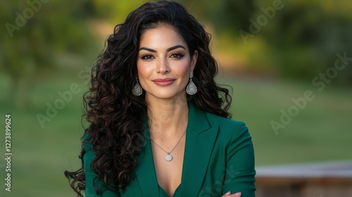 Confident woman in green blazer poses outdoors with elegant jewelry and curly hair in a serene park setting