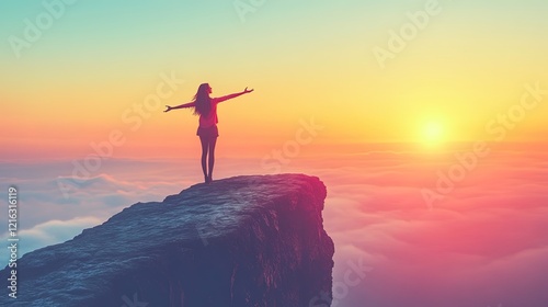 Confident woman reaching the top of a cliff, arms open to the horizon, symbolizing leadership and achievement