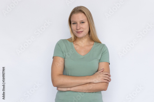 woman, female, smiling, calm, polite, nice, friendly, relaxed, caucasian, young, long hair, blonde hair, fair hair, light hair, posing, green, t-shirt, casual attire, person, model, adult, white background, isolated, studio shot, portrait, horizontal, emotion, expression, feeling, expressing, welcoming, observing, observant, interested, front view, hand, happy, elegant, strong, strength, listening, attentive, kind, head, looking, camera, arm, crossed, confident